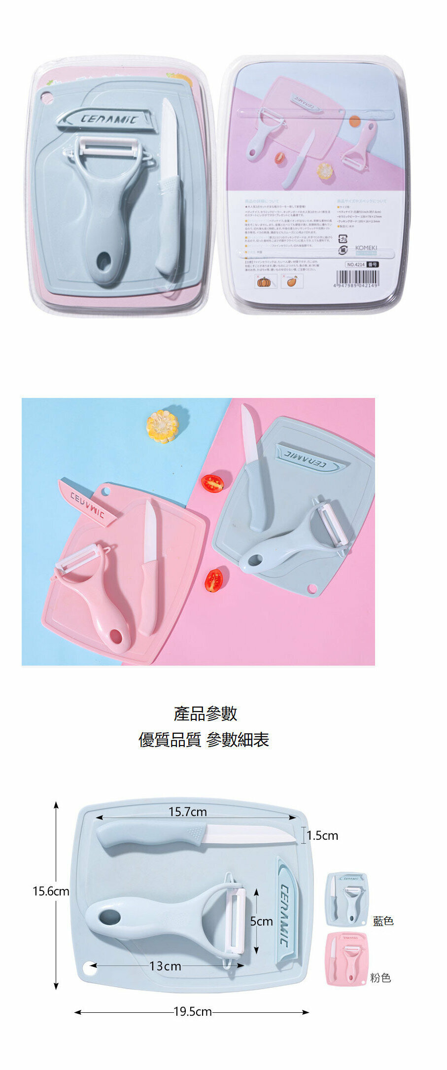 熱推(3件套裝)【藍色】陶瓷刀 削皮刀 砧板 水果刀 刨皮器 生果刀 防割刀