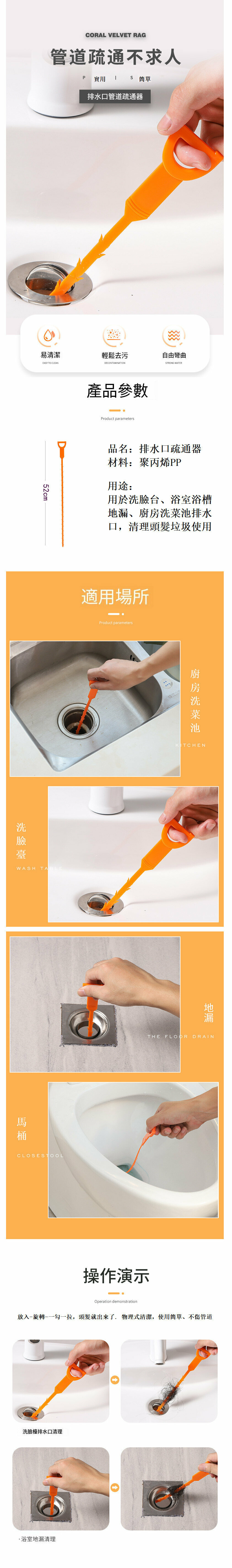 爆款(3條) 水槽毛髮清理器 頭髮收集器 下水道疏通清潔鈎 廚衛管道清潔棒 通渠佬下水道毛髮清理器【長度52cm】