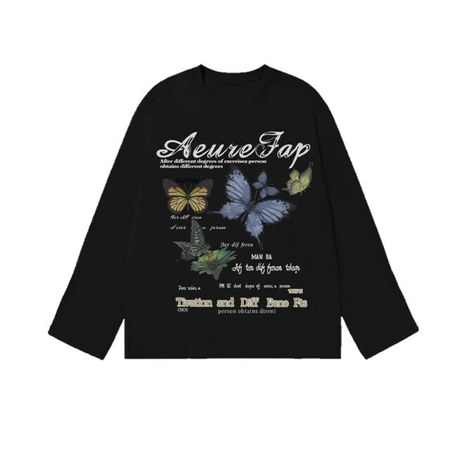 美式黑白設計感蝴蝶印花長袖T恤