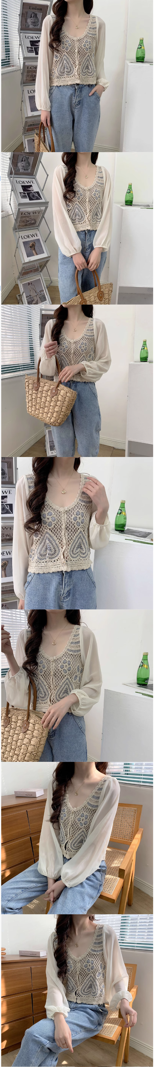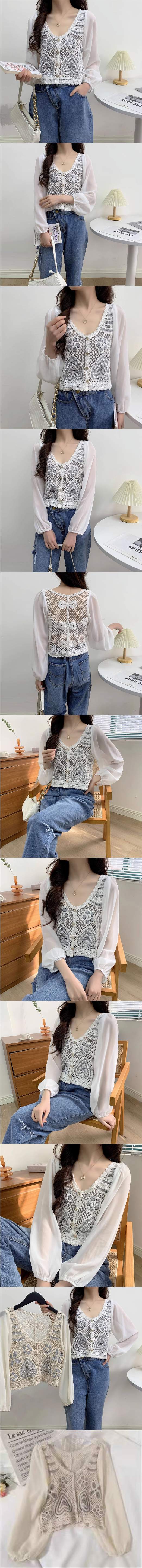 古鏤空愛心鉤花蕾絲拼接V領雪紡衫