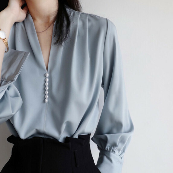 激抵休閒V領長袖襯衫女秋季(藍色【S_L碼】(下單後聯繫客服確認發貨尺碼)】