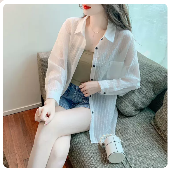 爆款雪紡條紋防曬襯衫(白色 尺碼:S-3XL)(下單後請聯絡客服確認發貨尺碼)