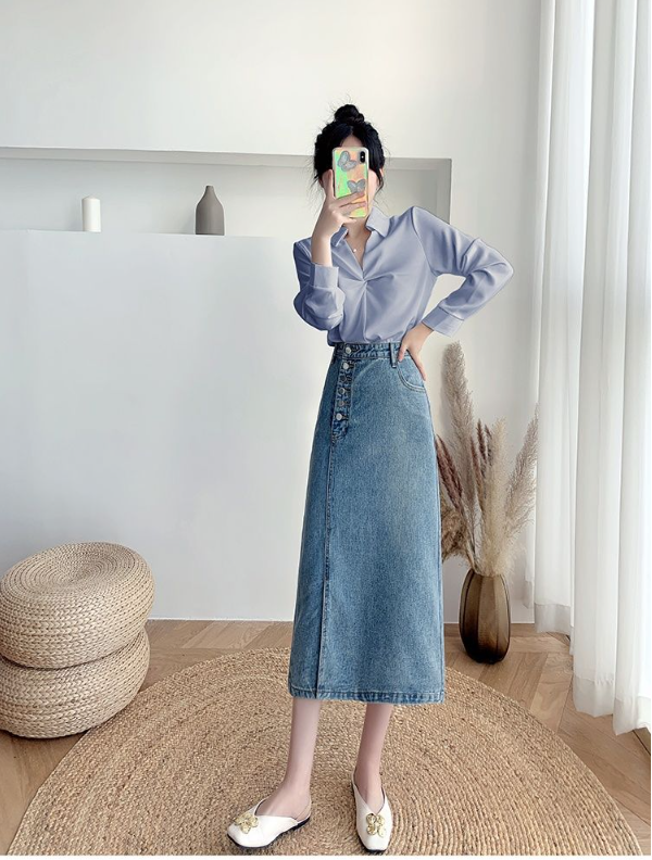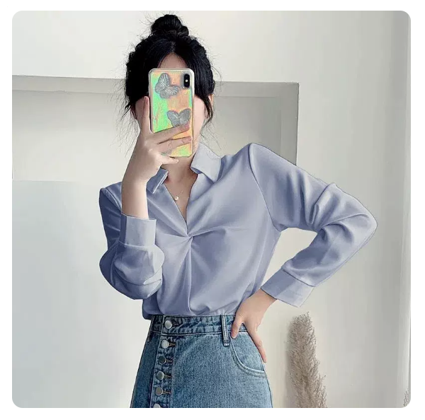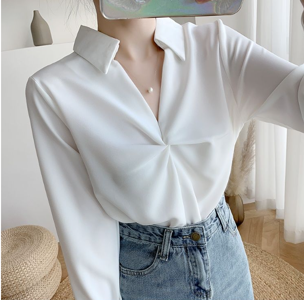 熱推雪紡V領褶皺長袖襯衫(藍色 尺碼:S-3XL)(下單後請聯絡客服確認發貨尺碼)