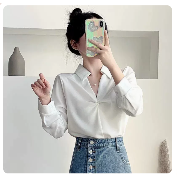 熱推雪紡V領褶皺長袖襯衫(白色 尺碼:S-3XL)(下單後請聯絡客服確認發貨尺碼)