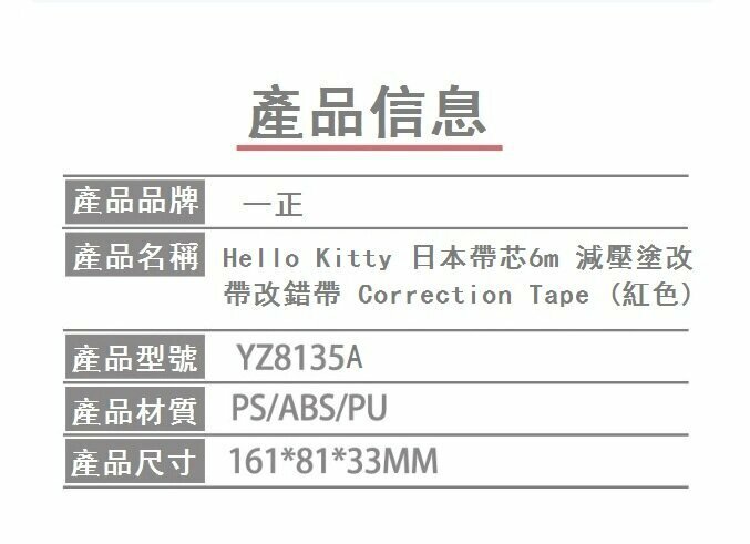 熱賣塗改帶-Hello Kitty 日本帶芯6m 減壓改錯帶 Correction Tape (紅色)(單個)