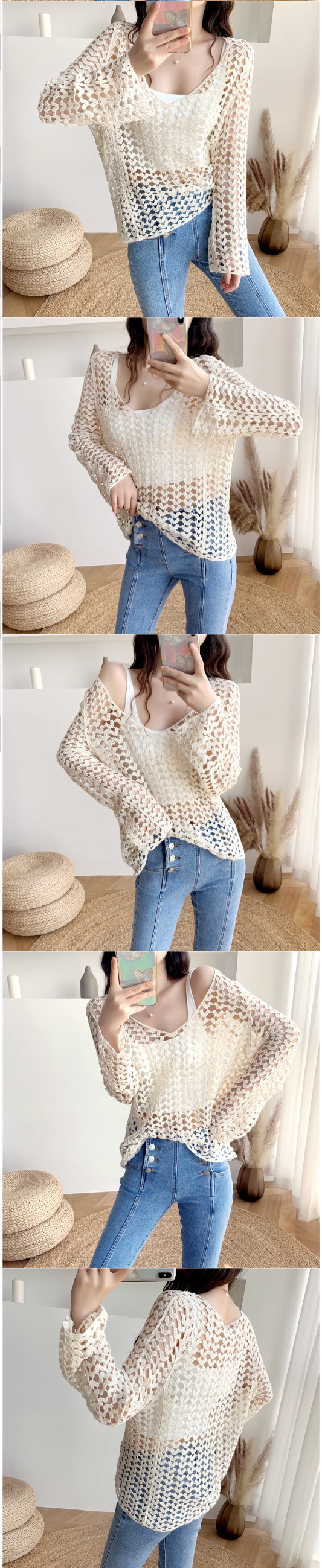 激抵鏤空露肩V領防曬衫罩衫針織衫上衣(白色)(均碼)