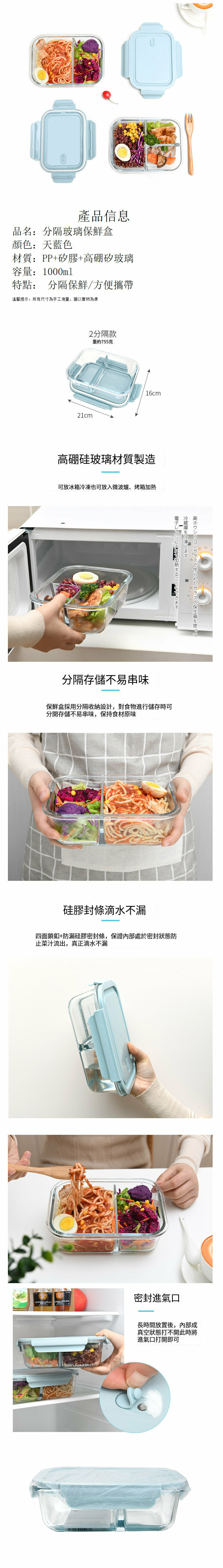 爆款分隔玻璃保鮮盒 耐熱便當盒 微波爐長方形餐盒【天藍色1000L2格】