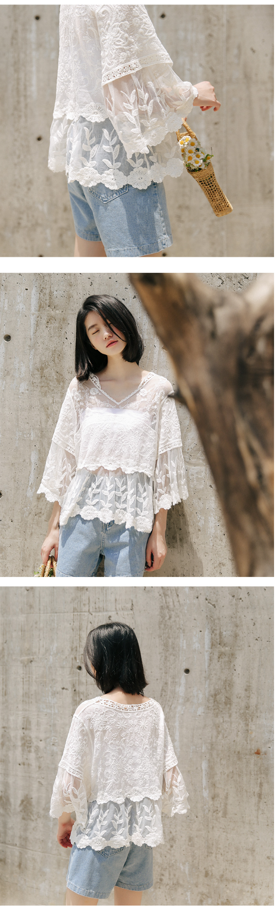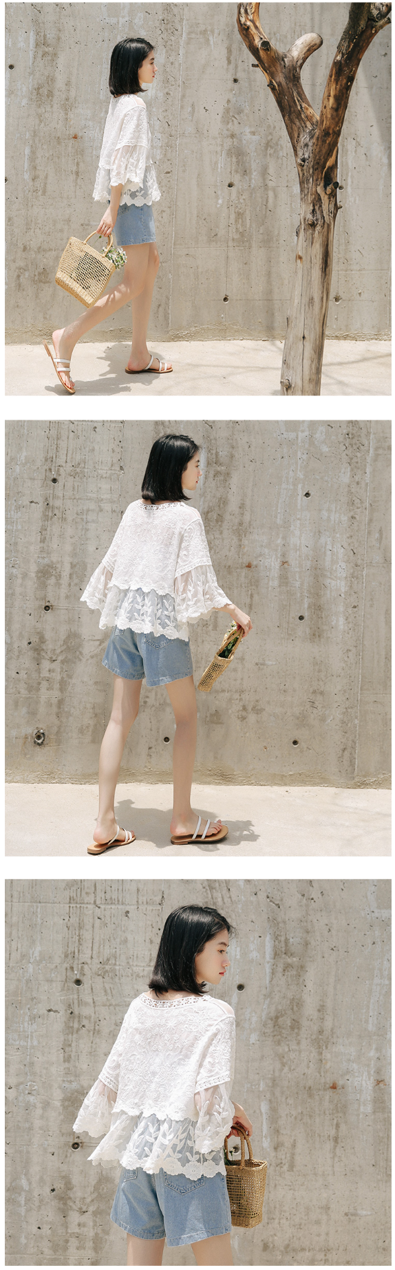 熱推繡花蕾絲衫寬松喇叭袖上衣(米白色)(均碼)