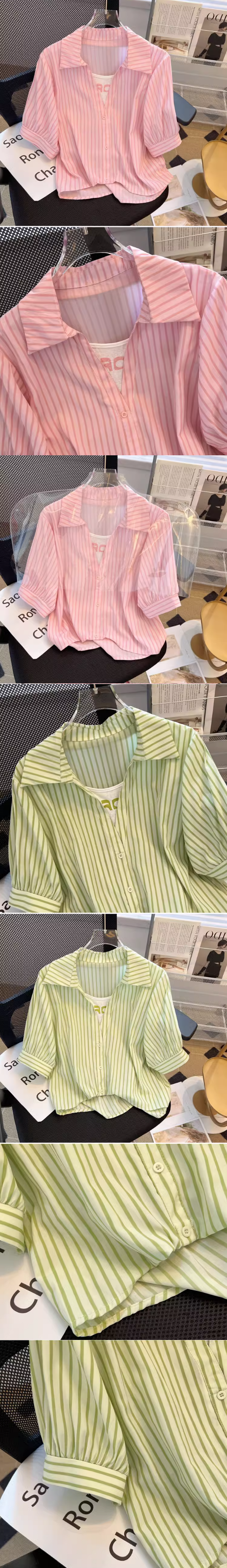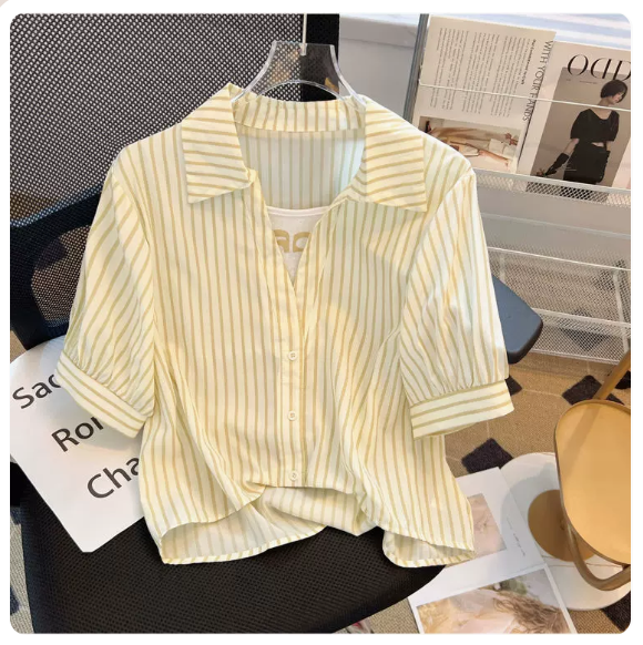 熱賣假兩件條紋短袖襯衫(杏色 尺碼:S-3XL)(下單後請聯絡客服確認發貨尺碼)