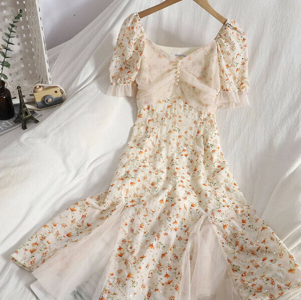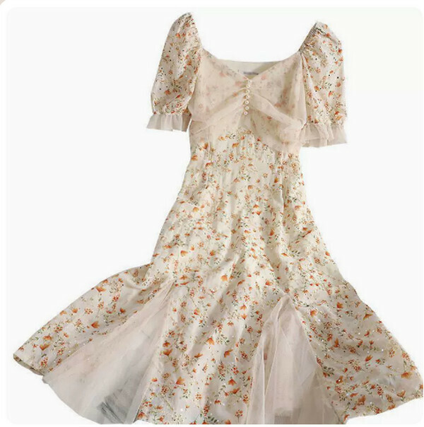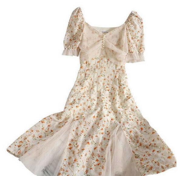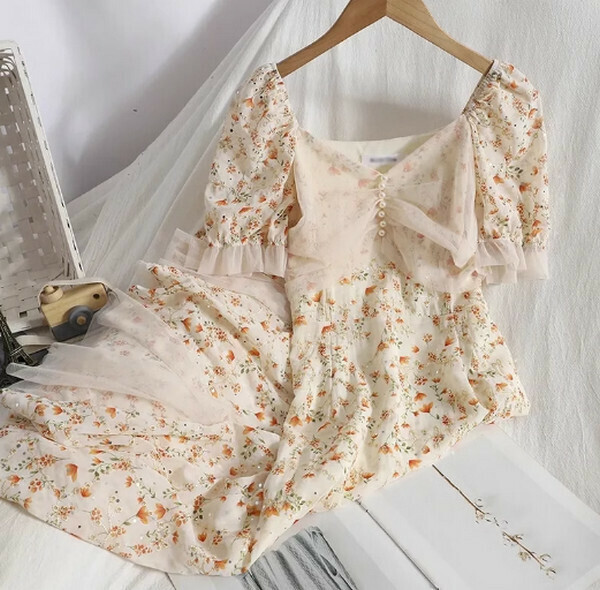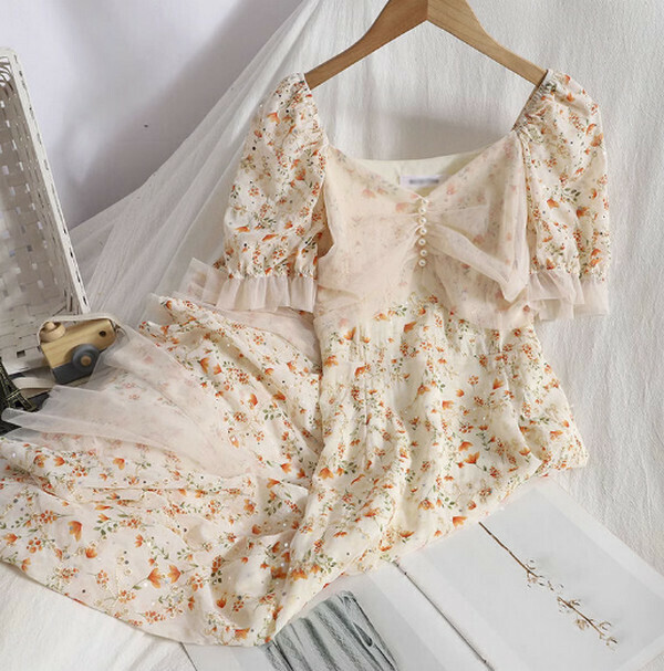 熱推溫柔少女風碎花裙時尚減齡連衣裙(杏色)【M-4XL碼】【下單後聯系客服確認尺碼】】