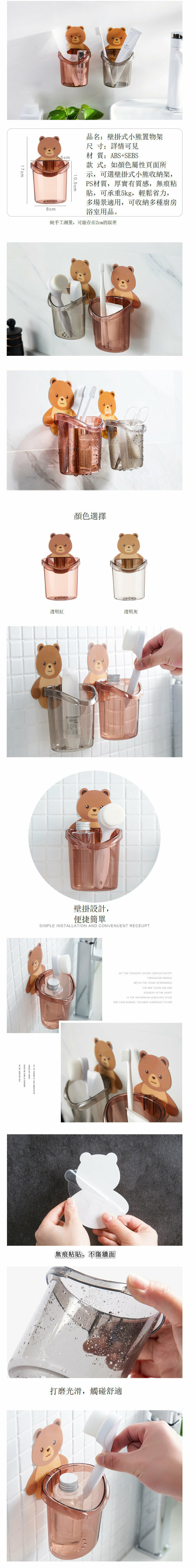 激抵[灰色] 黏貼式小熊圖案牙膏牙刷架 免打孔掛牆置物架 [1個]