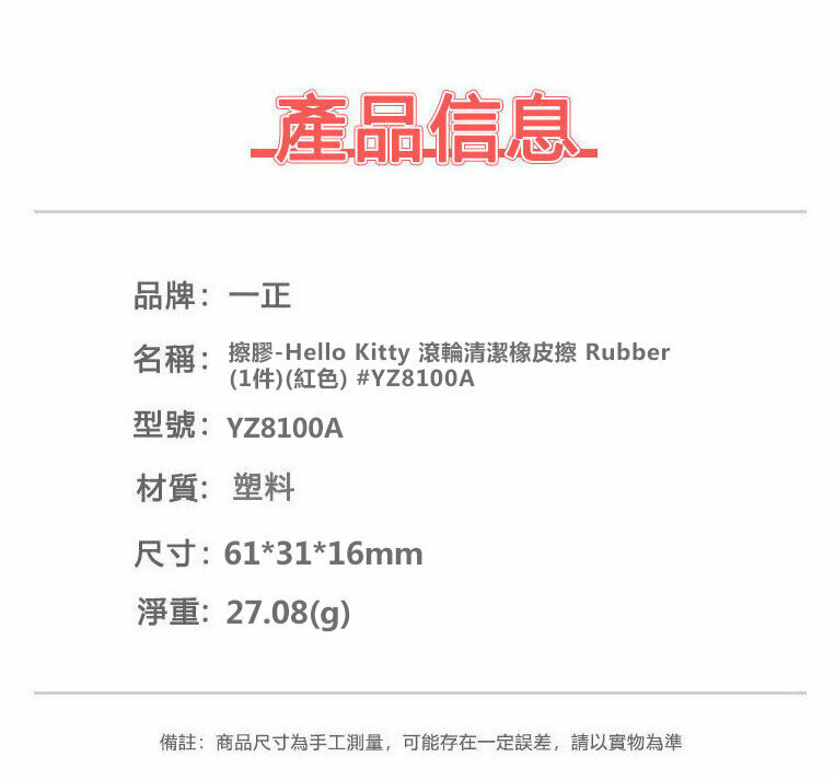 熱賣擦膠-Hello Kitty 滾輪清潔橡皮擦 Rubber(1件)(紅色)