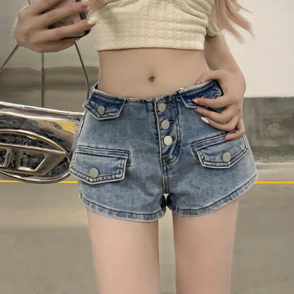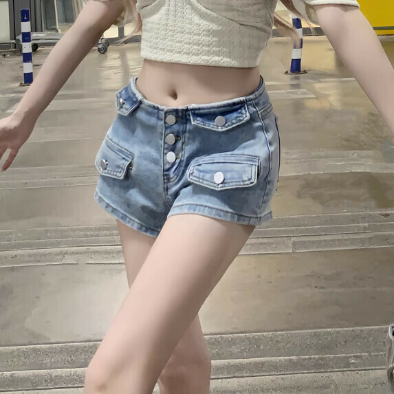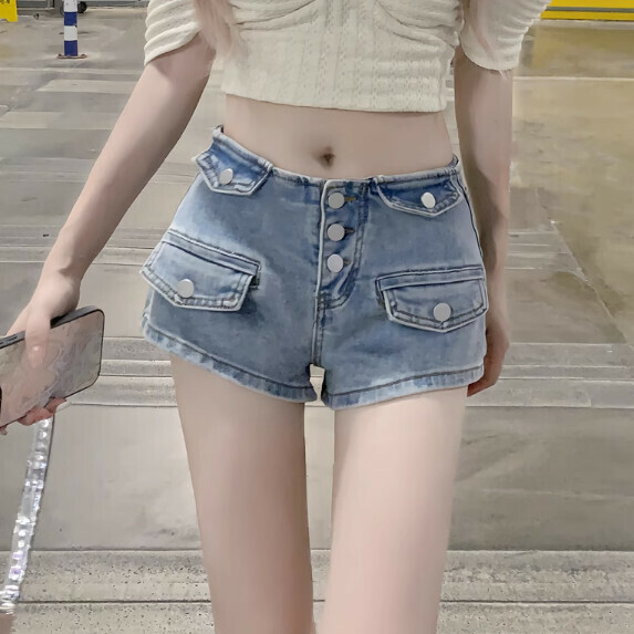 熱推高腰排扣牛仔闊腿短褲女夏季(淺藍色【S_XL碼】(下單後聯繫客服確認發貨尺碼)】