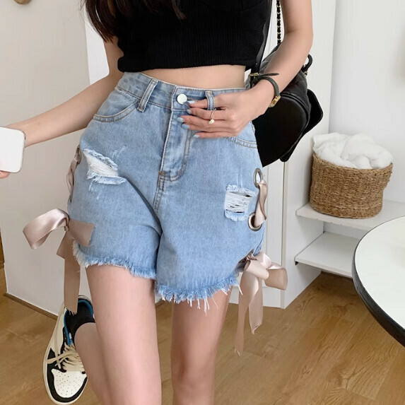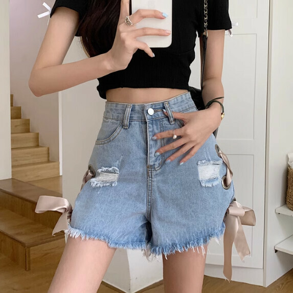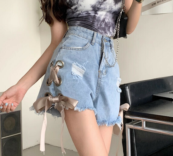 熱推高腰牛仔側邊綁帶闊腿短褲女夏裝(淺藍色【S_XL碼】(下單後聯繫客服確認發貨尺碼)】