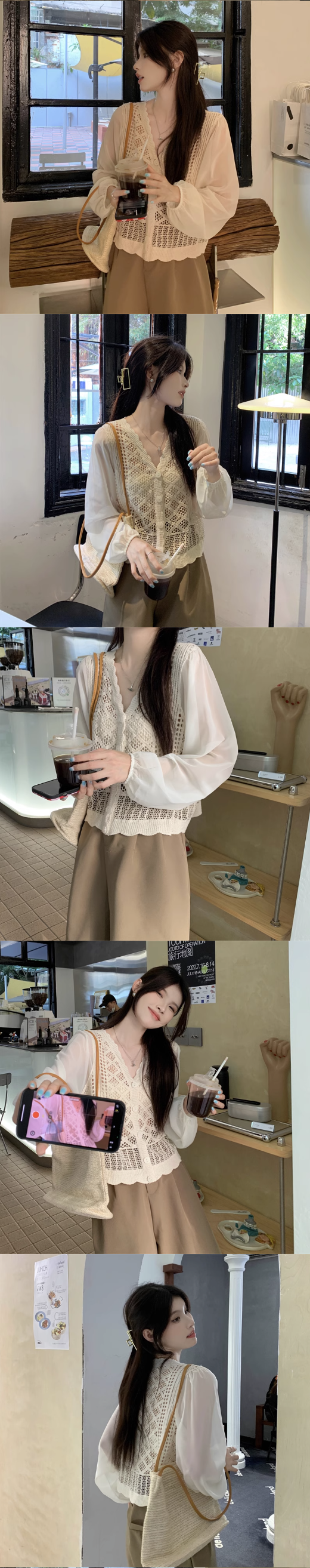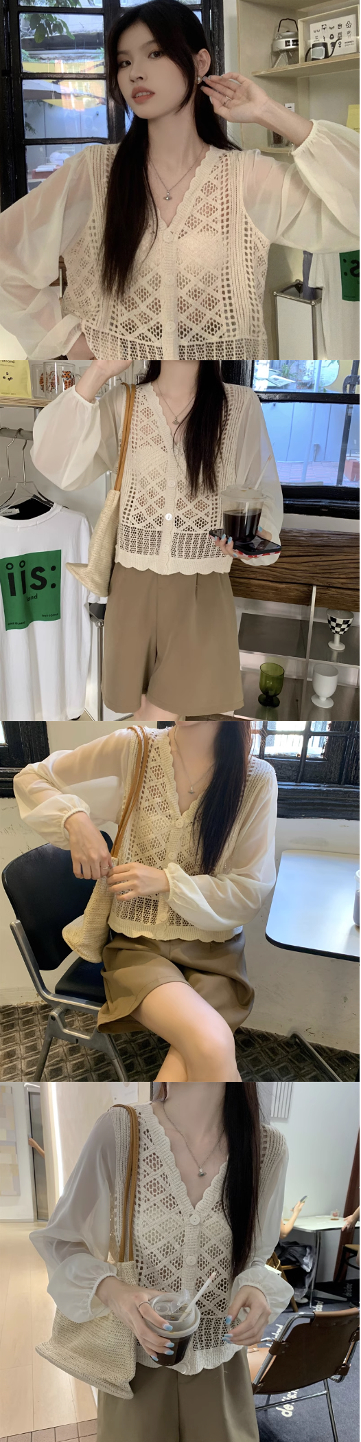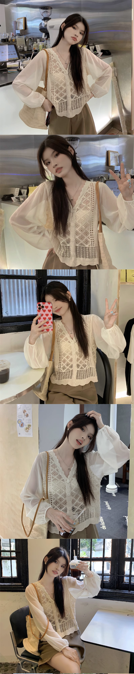 鏤空鉤花襯衫雪紡拼接長袖V領防曬上衣