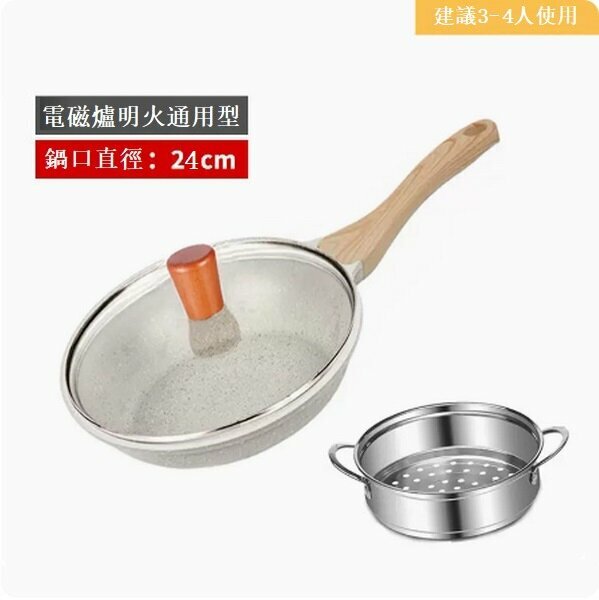 熱推麥飯石平底鍋不粘鍋【(加厚款)24cm+鋼化蓋+蒸籠(煎炒兩用)】