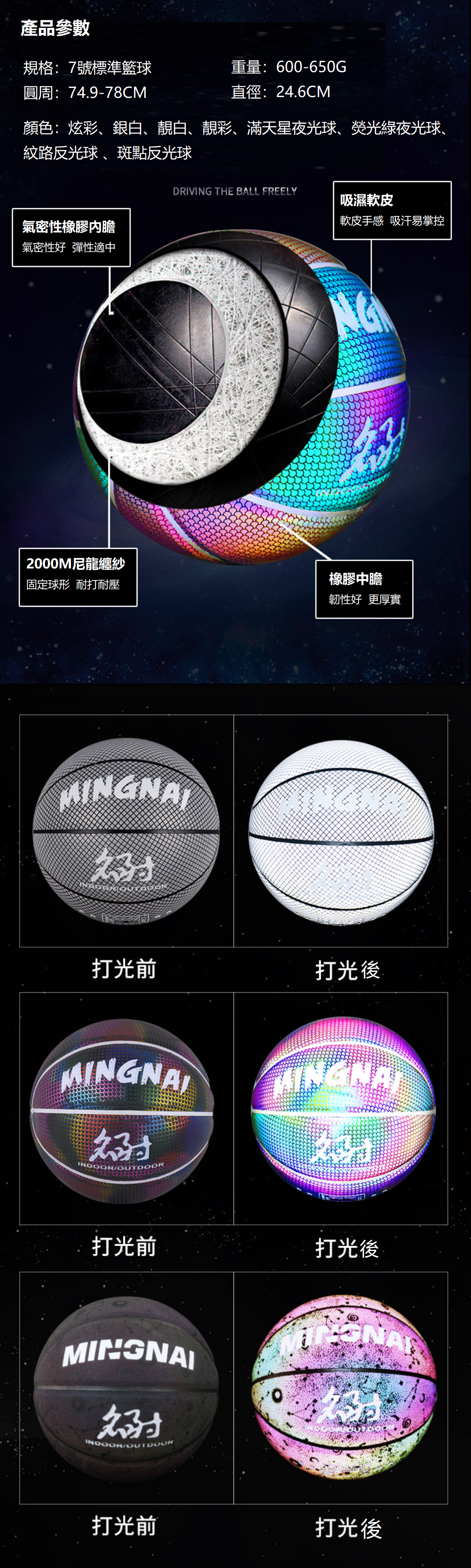 熱推【1個】7號反光籃球(顔色:炫彩色 材質:PU 氣筒氣針網兜球包)