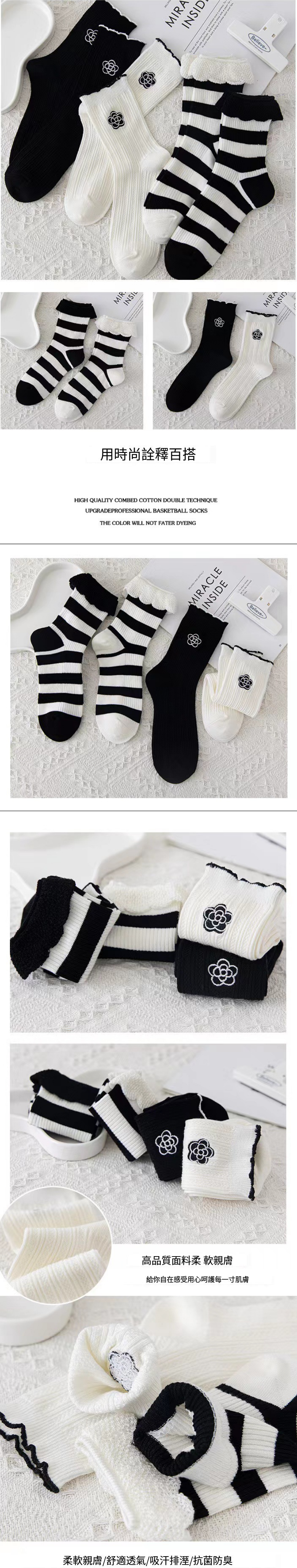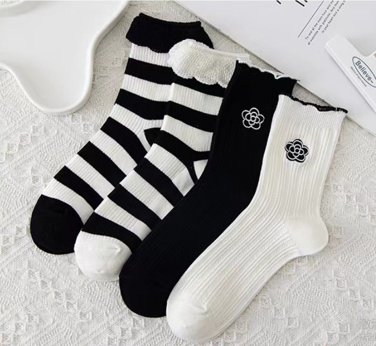 熱推(10雙裝)女花邊中筒襪(黑羅口條紋)(均碼)