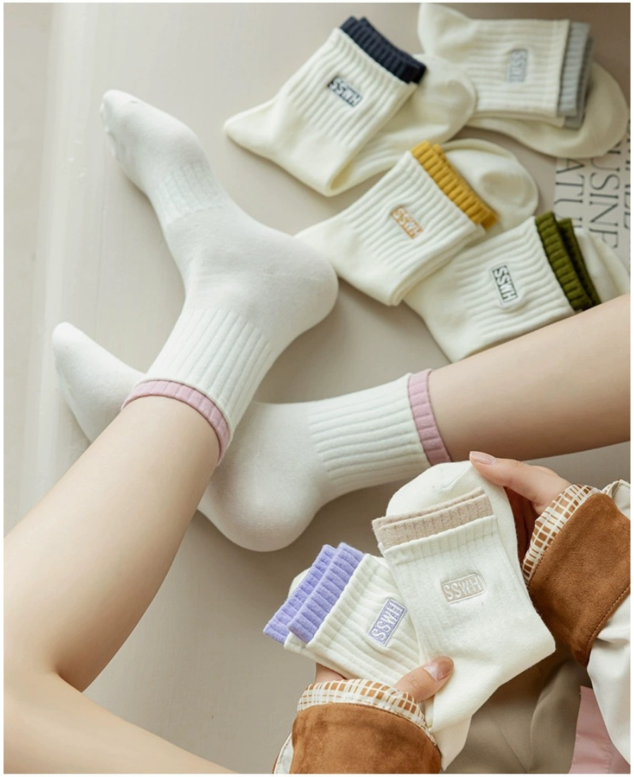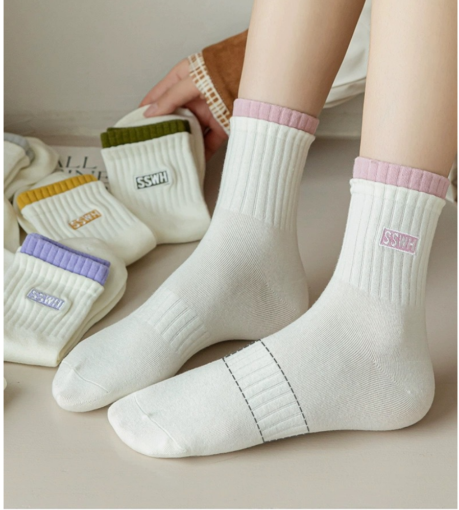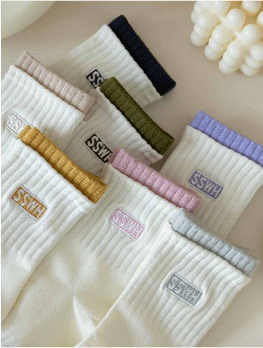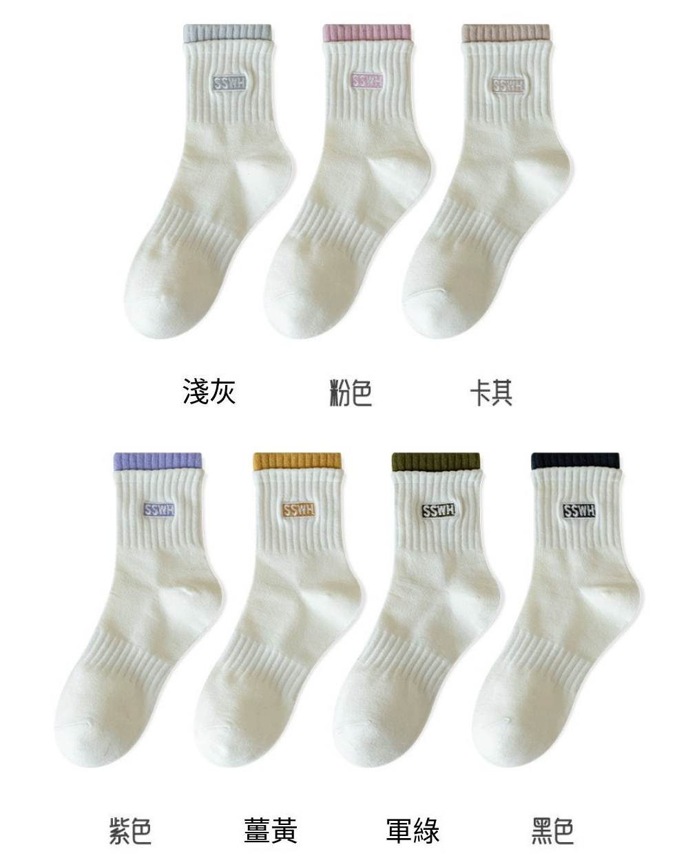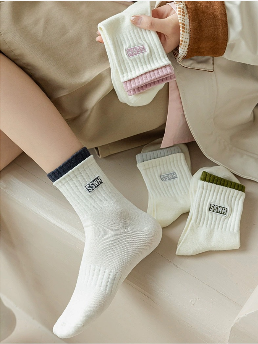 熱推(3雙裝)女雙羅口字母刺繡中筒襪(卡其)(均碼)