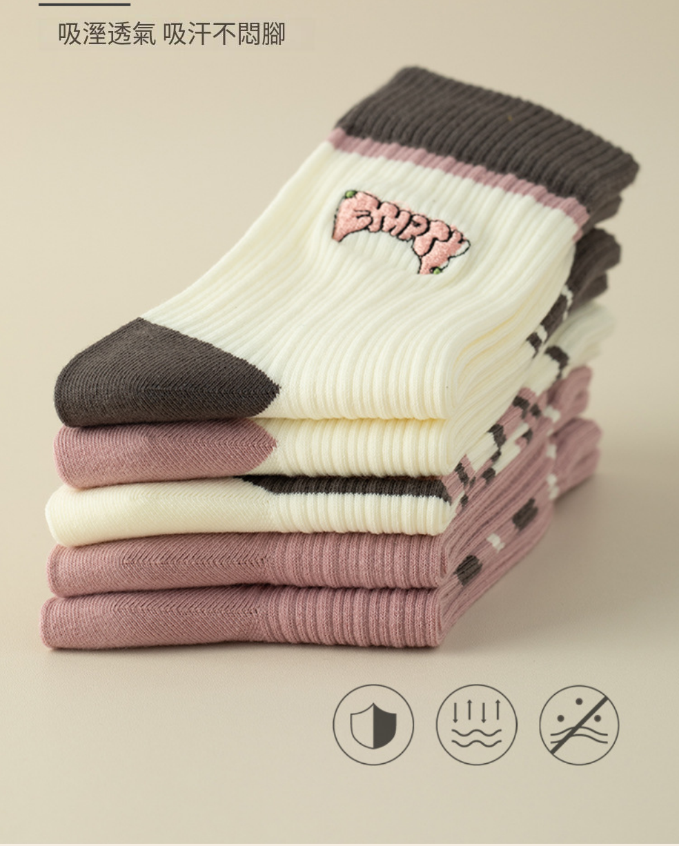 熱推(5雙裝)女日繫條紋中筒棉襪(刺繡英文)(均碼)