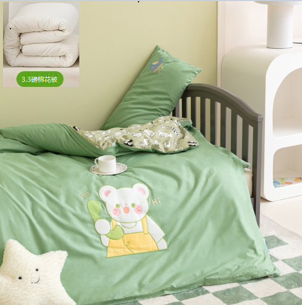 熱推純棉兒童被套+墊套+枕套(綠色電話熊【B類/抗菌/防蟎/0甲醛】)(3.3磅棉花芯六件套)