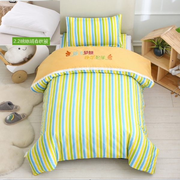 熱推純棉兒童被套+墊套+枕套(黃綠小彩條)(2.2磅羽絲絨六件套)