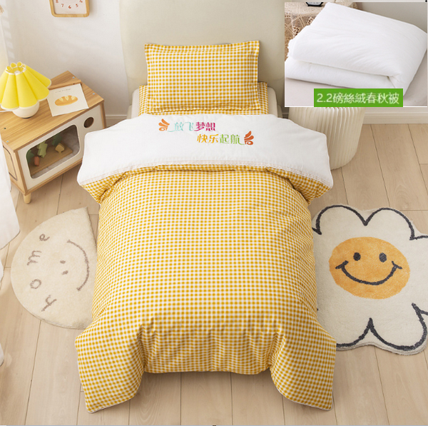 熱推純棉兒童被套+墊套+枕套(黃白小格)(2.2磅羽絲絨六件套)