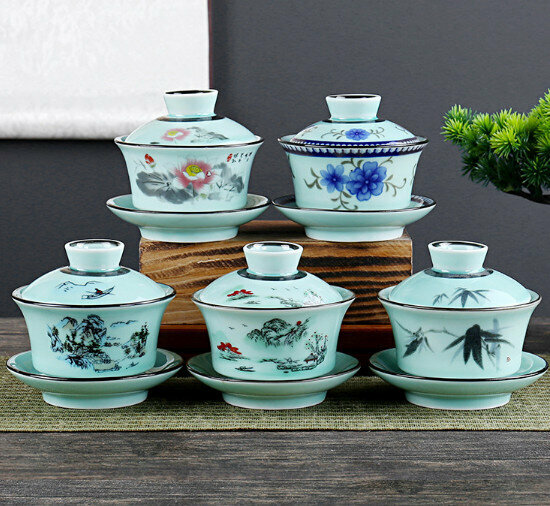 熱推簡約陶瓷帶蓋碗茶杯(綠釉雅香)