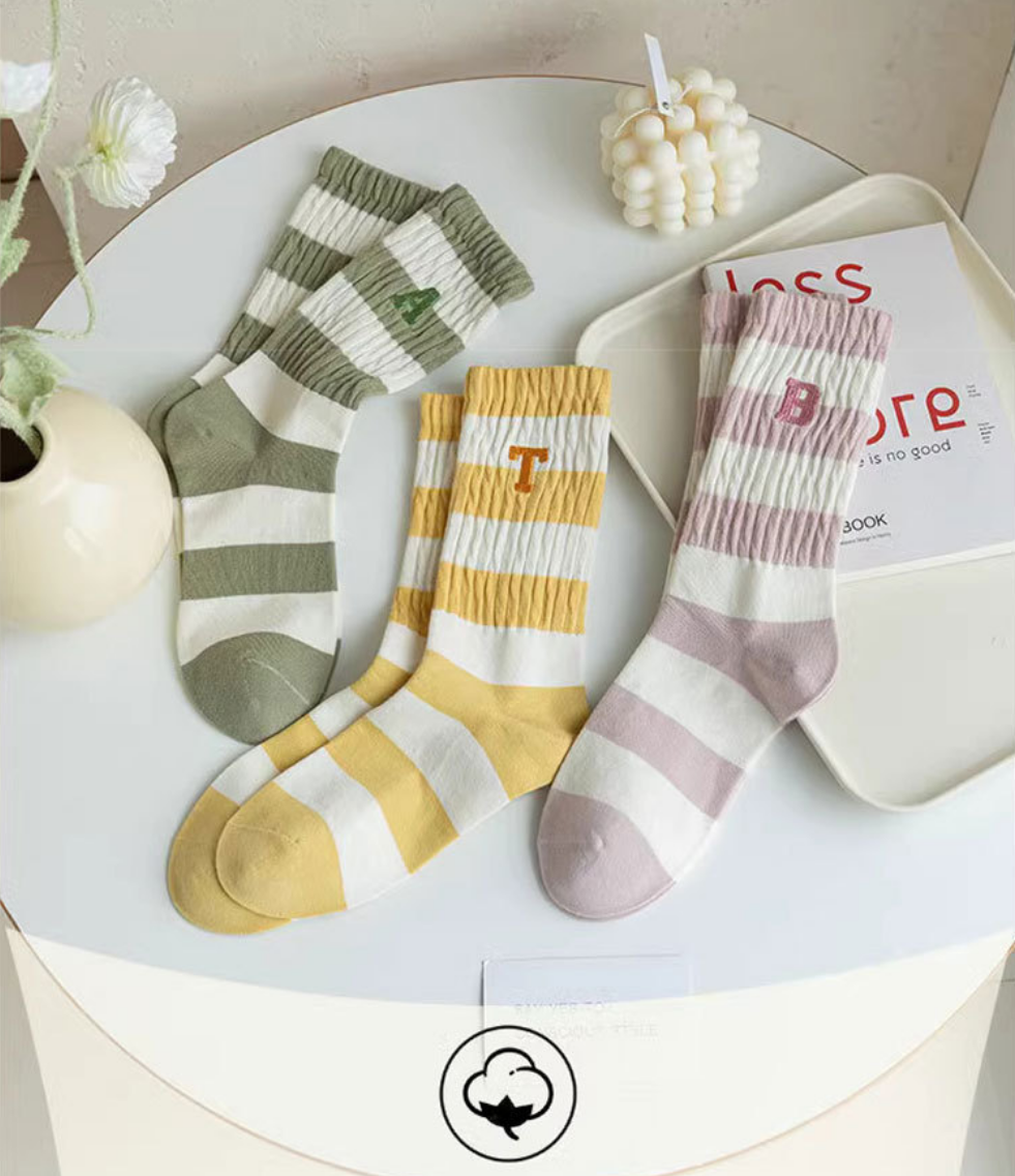 熱推(2雙裝)女日繫條紋刺繡堆堆襪(字母A)(均碼)