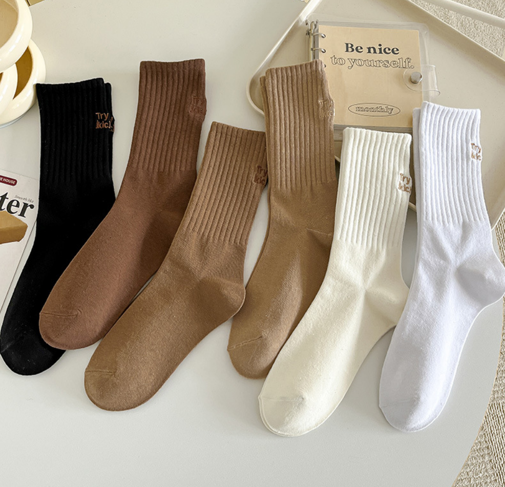 熱推(2雙裝)女純色刺繡中筒襪(米白)(均碼)
