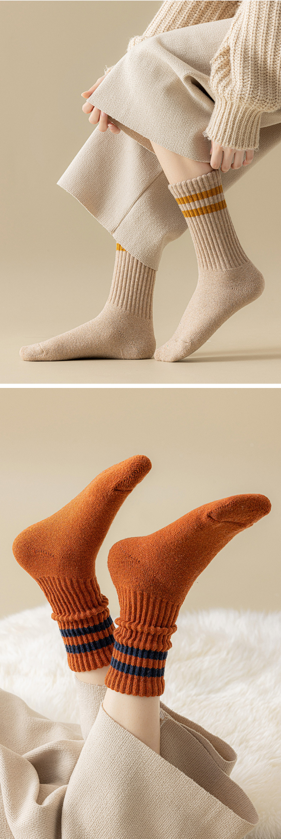 熱推(2雙裝)女條紋雙槓運動毛巾中筒襪(卡其)(均碼)