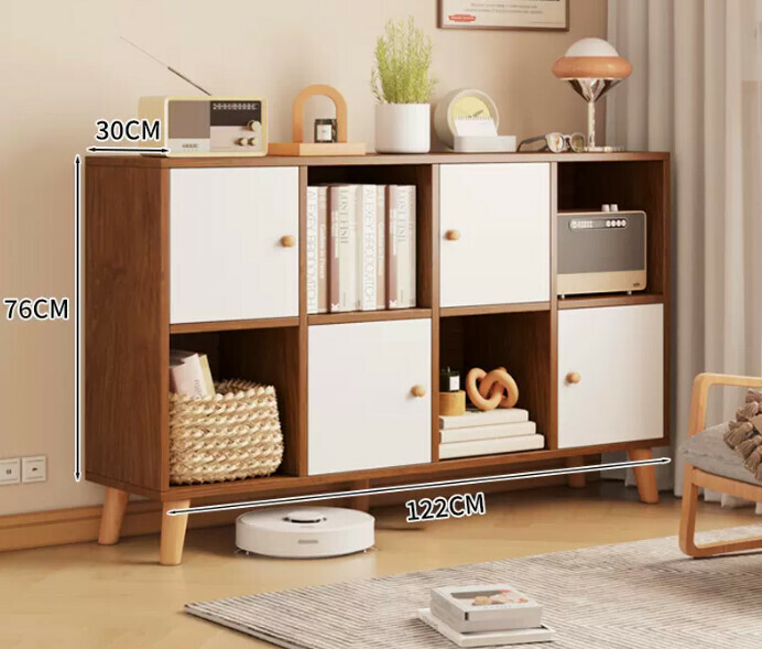 熱推書架置物架落地書櫃(帶腿四格四門櫻桃木色+白門)
