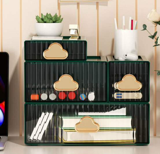熱推桌面收納盒【綠色3層組合(2扁中+2加大)】