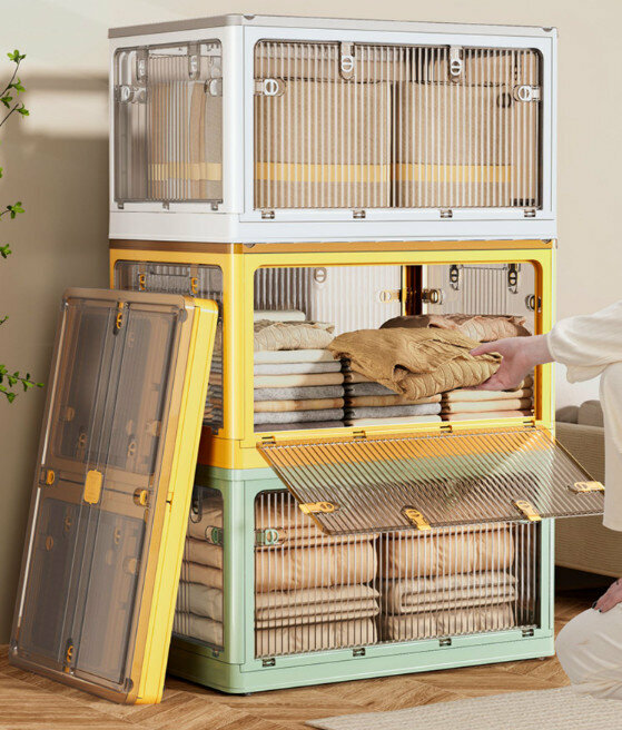 熱推折疊收納箱【茶色-象牙白】【60*42*34cm】【特大號(陞級五面開門/三秒折疊/帶防塵盒滑輪)】