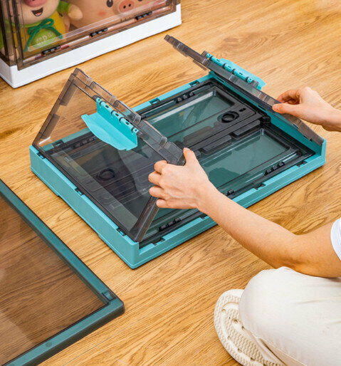 熱推折疊收納箱【透明-靜謐藍】【41*29*24cm】【中號(三面開門/可折疊/帶滑輪)】