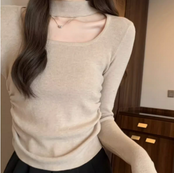 熱推掛脖短款長袖T恤針織上衣(杏色均碼)