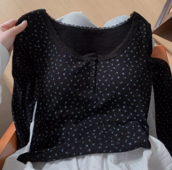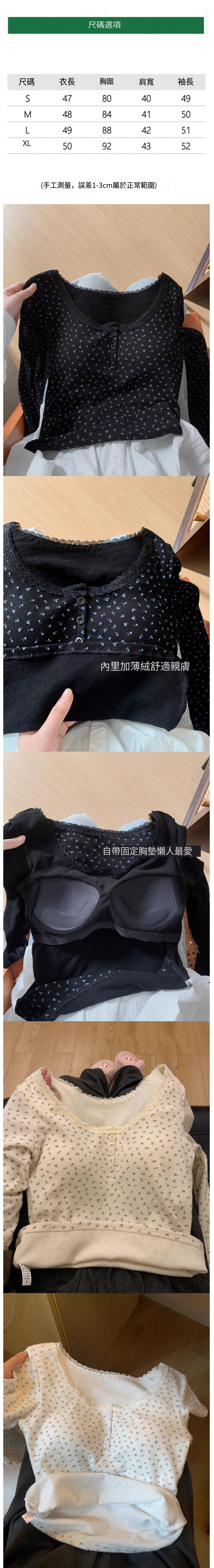 熱推蕾絲碎花帶胸墊長袖打底衫(黑色S-XL)(下單後聯絡客服確認發貨尺碼)