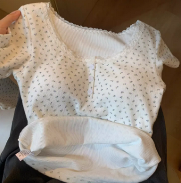熱推蕾絲碎花帶胸墊長袖打底衫(白色S-XL)(下單後聯絡客服確認發貨尺碼)
