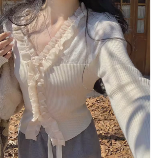 熱推蕾絲花邊長袖針織衫(白色均碼)