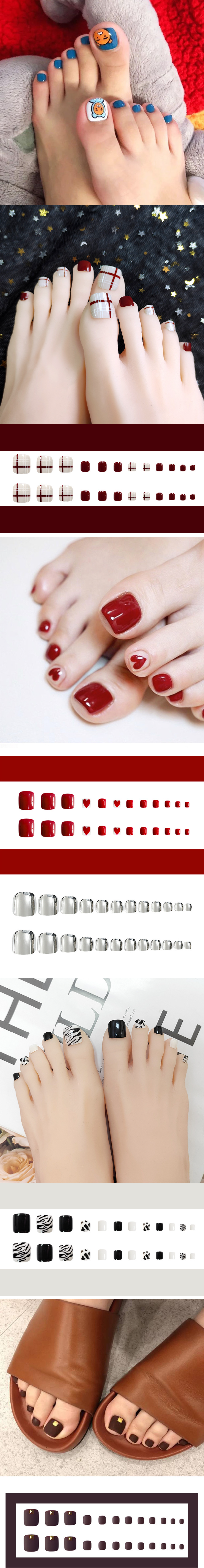熱推美甲 腳趾穿戴甲-印刷酒紅格子(膠水款J03#)