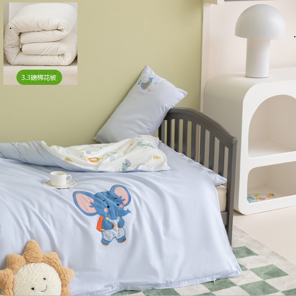 熱推純棉兒童被套+墊套+枕套(藍色上學小象【B類/抗菌/防蟎/0甲醛】)(3.3磅棉花芯六件套)