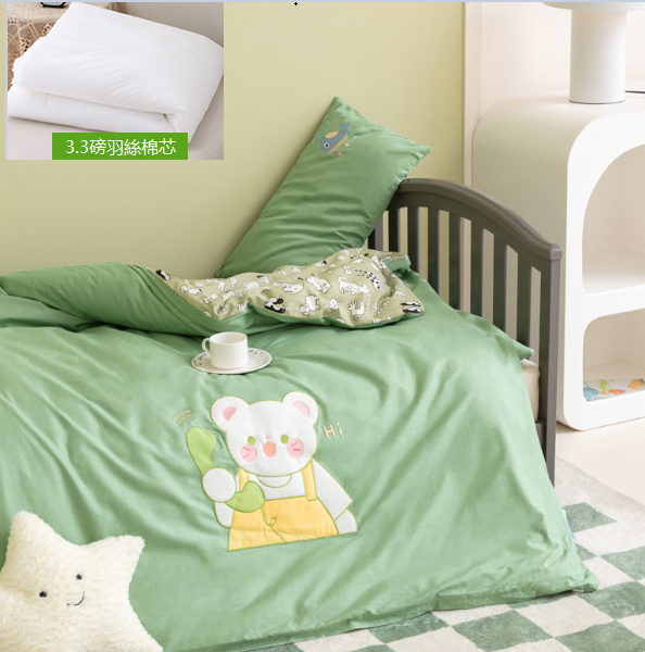 熱推純棉兒童被套+墊套+枕套(綠色電話熊【B類/抗菌/防蟎/0甲醛】)(3.3磅羽絲棉芯六件套)