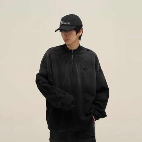 熱推復古洗水做旧漸变半拉鍊衛衣【黑色水洗S-XL碼,下單後與客服確認發貨尺碼】