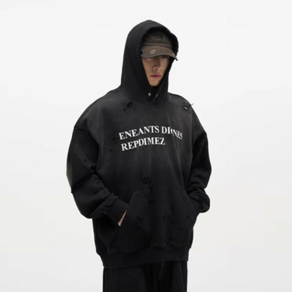 熱推復古水洗做舊漸变破洞連帽衛衣【黑色S-XL碼,下單後與客服確認發貨尺碼】