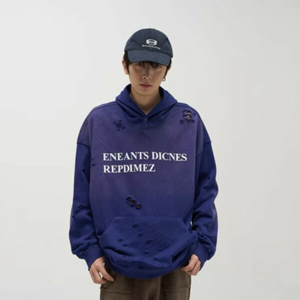 熱推復古水洗做舊漸变破洞連帽衛衣【藍色S-XL碼,下單後與客服確認發貨尺碼】
