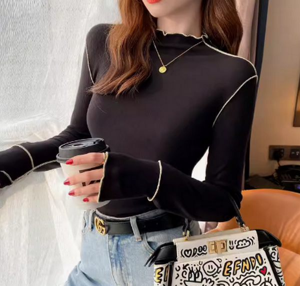 熱推女士半高領木耳邊長袖T恤上衣(黑色均碼)