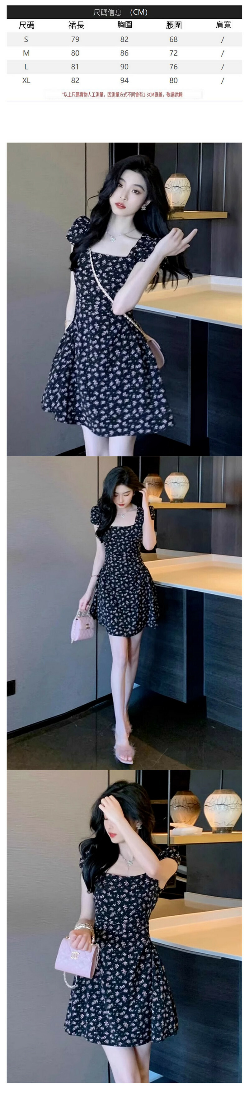 熱賣方領碎花連衣裙(黑色 S碼-XL碼)(下單後請聯絡客服確認發貨尺碼)