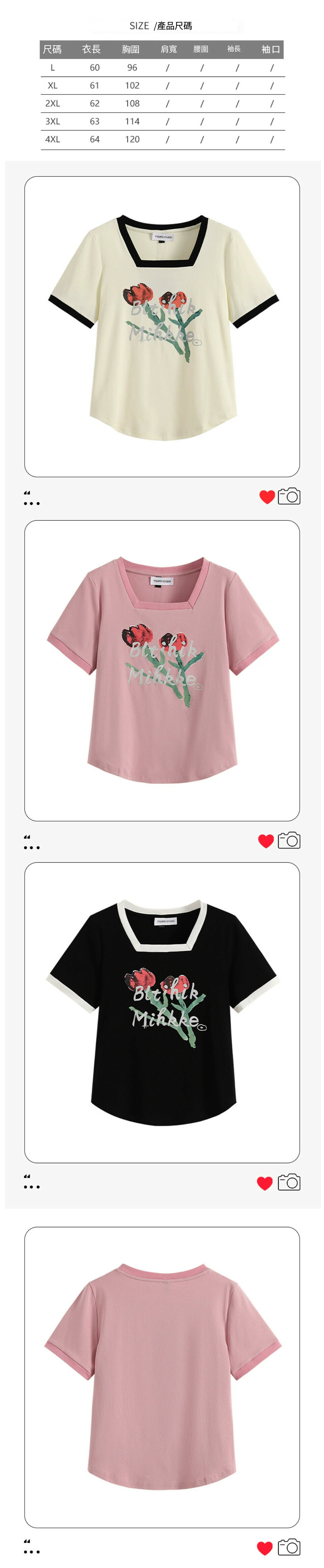 熱賣方領印花短袖T恤【杏色】【L-4XL碼】(下單後請聯絡客服確認發貨尺碼)