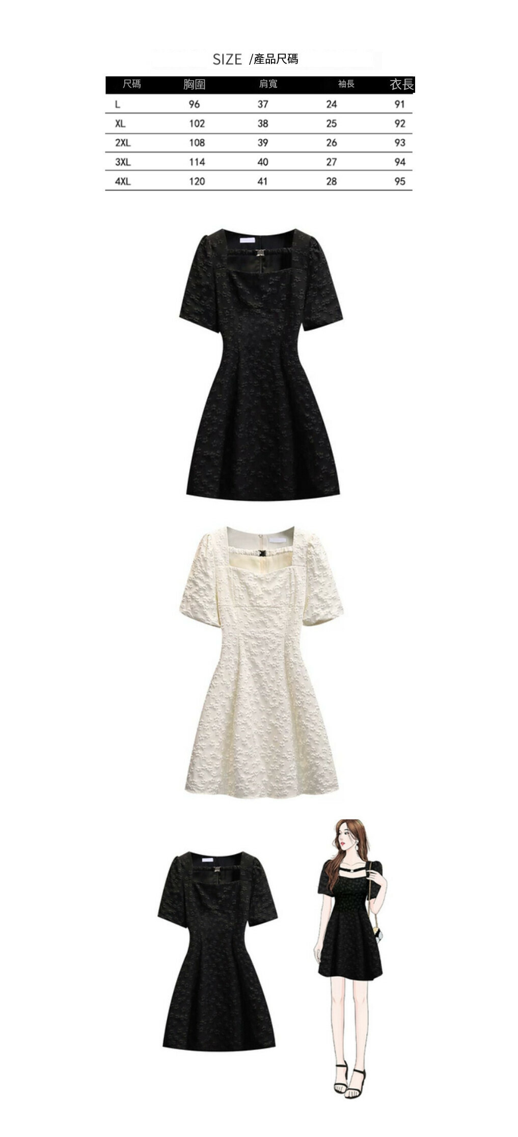 熱賣方領收腰連衣裙【米白色】【L-4XL碼】(下單後請聯絡客服確認發貨尺碼)