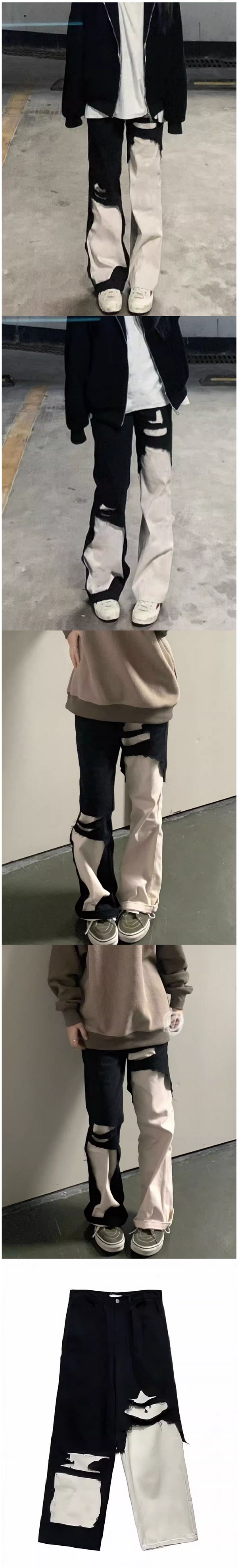 熱賣美式vibe復古拼接撞色破洞牛仔褲女高街寬鬆直筒工裝褲ins潮(下單後聯絡客服確認發貨尺碼)